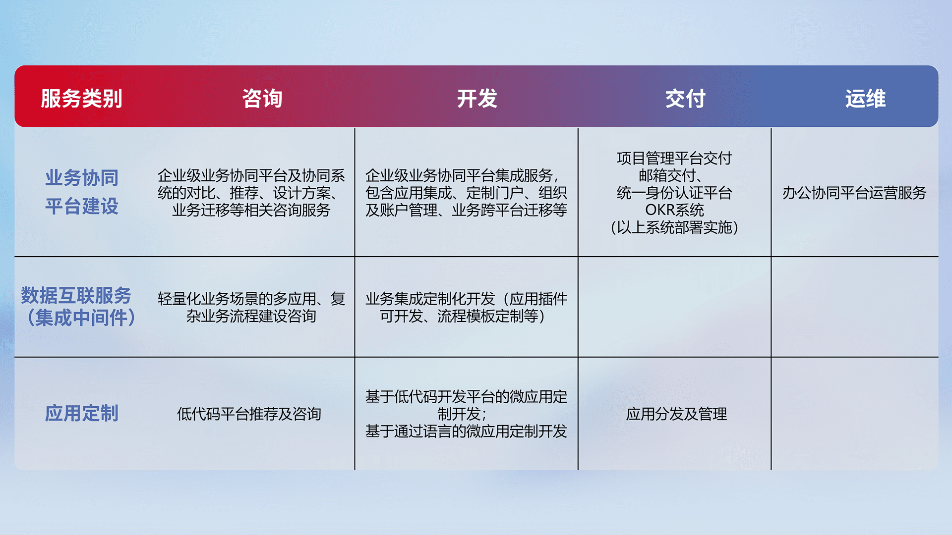 针对钉钉、、、、企微、、、IDaas等平台级产品提供产品的规划、、方案、、、交付、、、、定制化开发等服务,,实现如统一协同办公、、、、智能客户服务、、混合会议管理、、智能数据查询、、、、等业务场景,,实现数字化转型。。