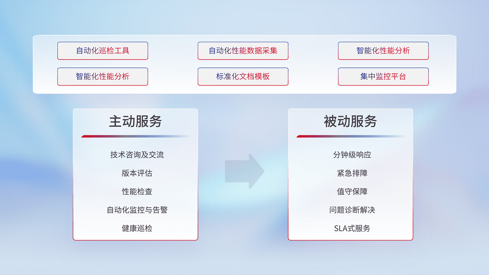 智能化工具和标准化文档,,,,保障服务质量,,,提供主动服务(包含技术咨询、、版本评估、、性能检查、、、、自动化监控与告警、、、健康巡检)和被动服务包含(分钟级响应、、、、紧急排障、、、、值守保障、、、问题诊断解决、、SLA服务)。。。。